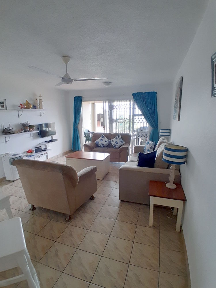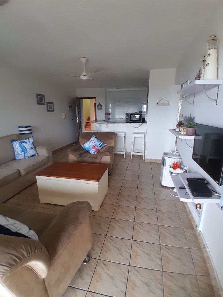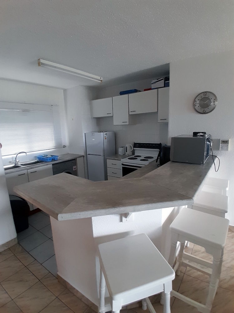 This unit is a ground floor unit with a sea view from patio and main bedroom. The unit has an open-plan fully equipped kitchen with a microwave, stove, fridge and tumble dryer and on site laundry facility. The eating counter seats 4 and divides the kitchen from the spacious lounge. The lounge opens onto a covered patio with sea view.