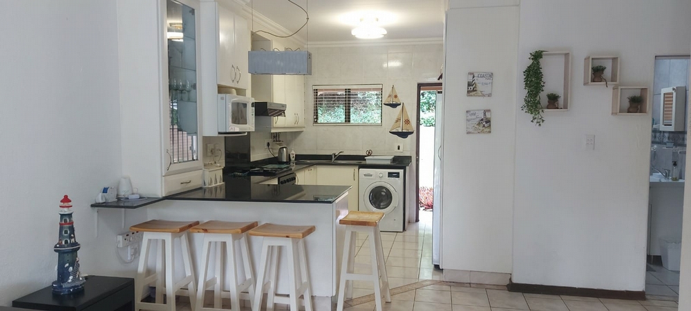 The spacious layout includes a queen bed in the master bedroom, a double bed and single bed bunks in the second room, plus a sleeper couch for smaller children. Your fully equipped kitchen, complete with washing machine, tumble dryer, and freezer, allows for effortless self-catering. The inviting lounge area with TV and limited DSTV provides the perfect space for evening relaxation after sun-filled days.